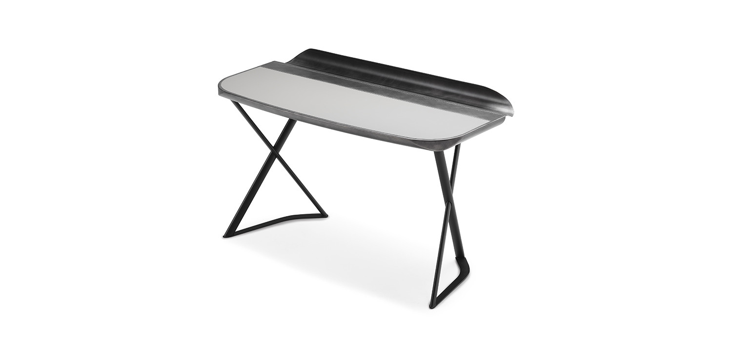 The elegant structure is further embellished by a leather top, rounded and painted in metal, as is the storage compartment.