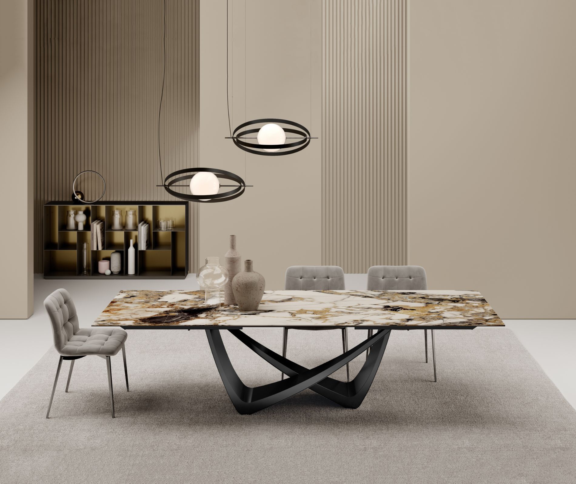 The base is made up of two curved elements, crossed together, and made of lacquered steel available in the colors of sand, dark brass, black or anthracite. The top is made of extra-clear glass, polished glass, matt scratch-resistant glass, and also in ceramic, supermarble, veneered wood and also solid wood. The Bach table, thanks to its multiple dimensions and finishes, is perfect for furnishing any environment and thus meeting the needs of the most demanding.