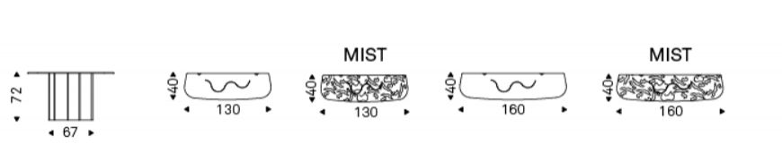 La estructura es de acero pintado y está disponible en varios acabados, como Oxybrass y Oxygrey, que le confieren un carácter metálico contemporáneo y complementan diversos estilos de interiorismo. El tablero está disponible en cristal extraclaro o cristal extraclaro texturizado (MIST), que aporta profundidad visual y refleja la luz con elegancia, creando interesantes juegos de sombras y reflejos.