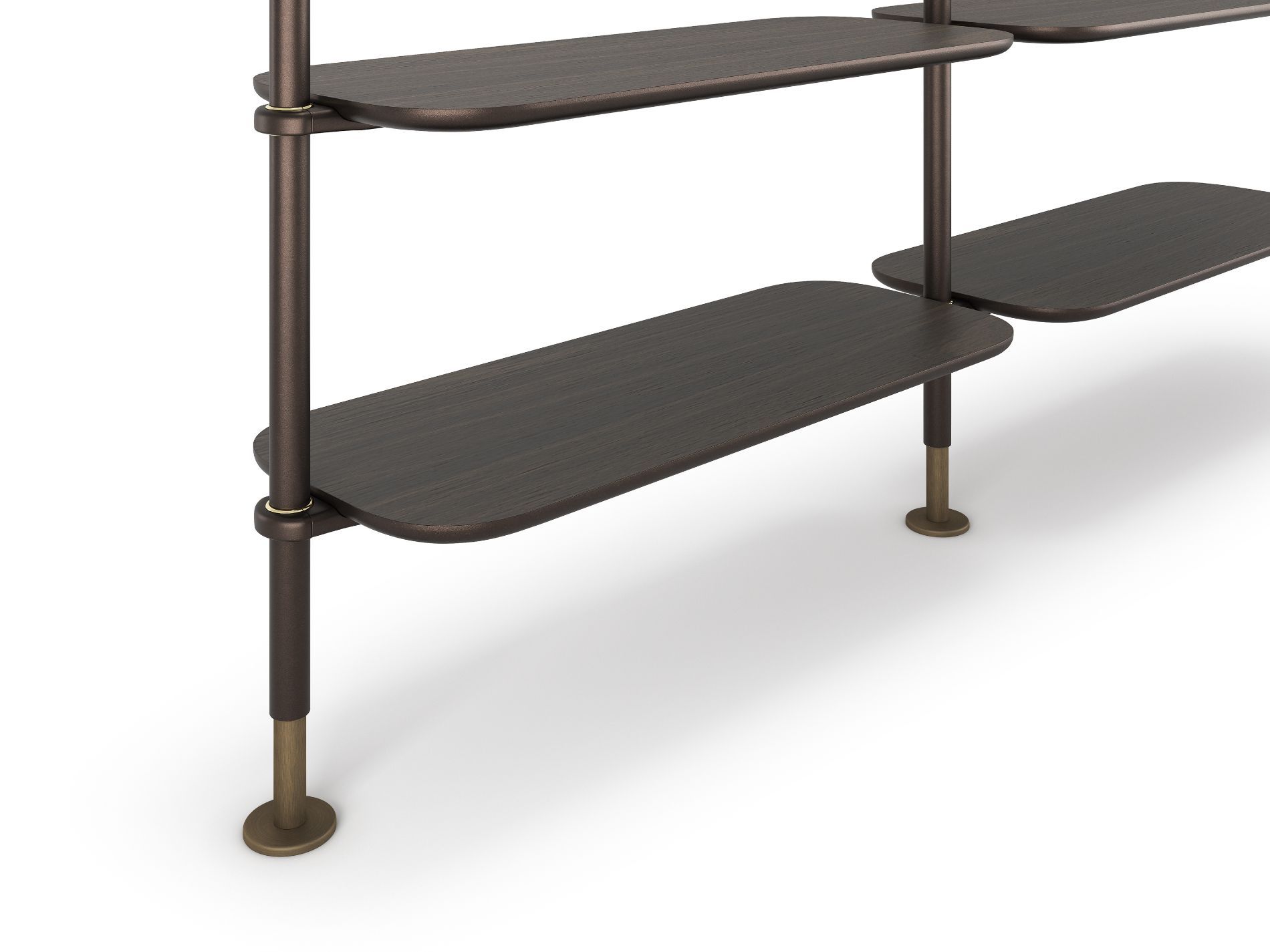 Les montants et les supports d'étagères sont en acier avec finition peinte en relief titane (GFM11), enrichie de détails en Oxygrey ou en bronze (GFM18) avec inserts Oxybrass.