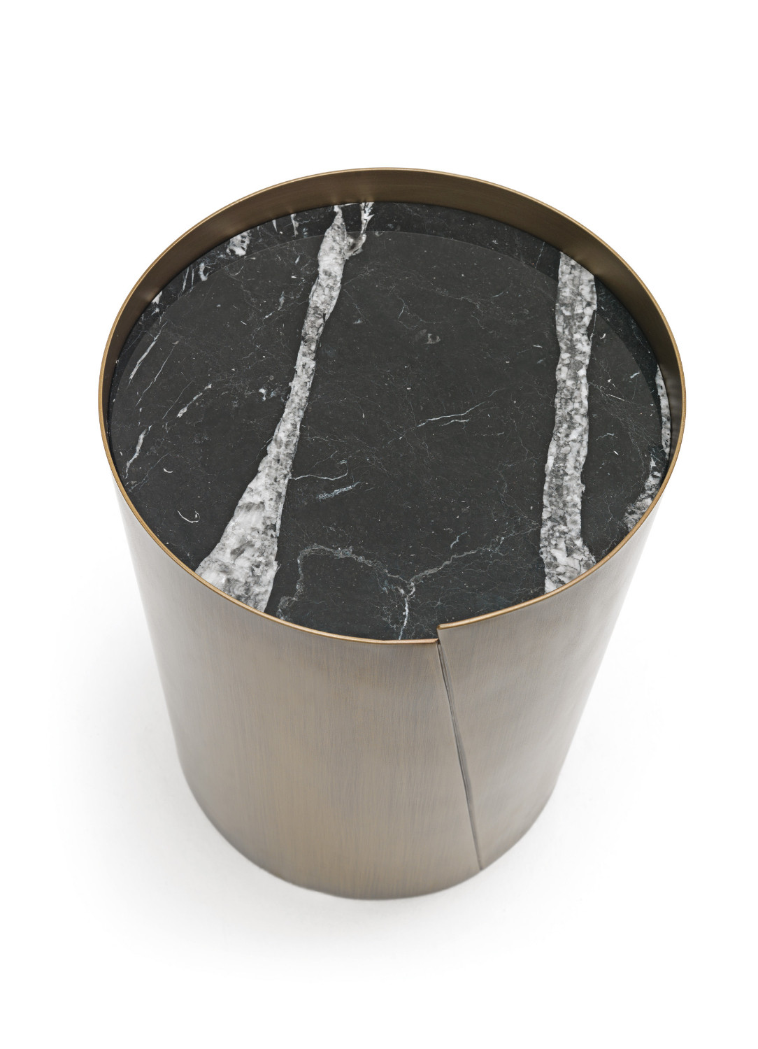 La table basse Antares a une forme cylindrique particulière, obtenue à partir d'une feuille de laiton vieilli courbée sur elle-même et fermée par une coupe inclinée pour loger à l'intérieur d'un plateau en marbre. Le design particulier du produit s'adapte à tout type de mobilier, donnant ainsi une touche originale à l'espace de vie.