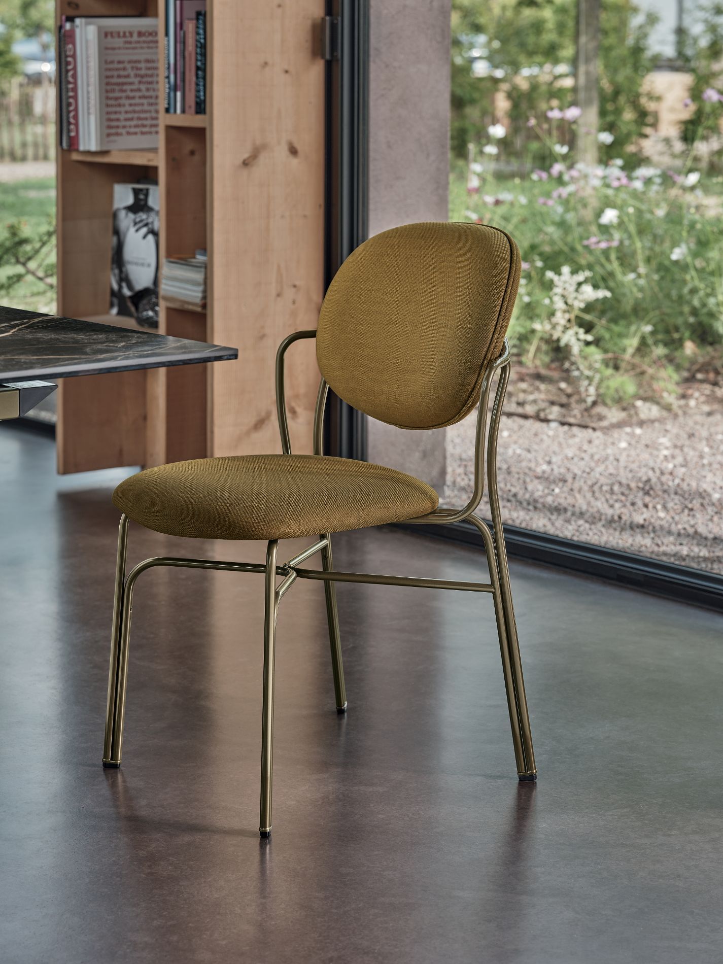La sedia Dada di Bontempi è una sedia da pranzo moderna ed elegante, perfetta per qualsiasi ambiente, da una cucina ad una zona giorno. La sedia Dada con o senza braccioli si compone di linee essenziali e semplici, sia nel basamento che nello schienale e nella seduta. La struttura è realizzata in acciaio laccato disponibile in tutti i colori del campionario, la seduta e lo schienale sono imbottiti e rivestiti in tessuto, pelle premium, pelle ecologica premium, velluto e tante altre textures e colorazioni, sia semplici che particolari.