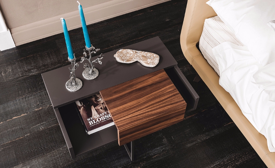 Il comodino Dante di Cattelan Italia è un complemento di design e personalità. La struttura è verniciata graphite o bianca e il piano scorrevole può essere in legno Noce canaletto o Rovere bruciato.