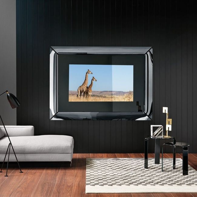 O espelho TV Caadre da Fiam é a combinação perfeita de clássico e tecnológico: espelho semi-reflexivo e TV ao mesmo tempo.