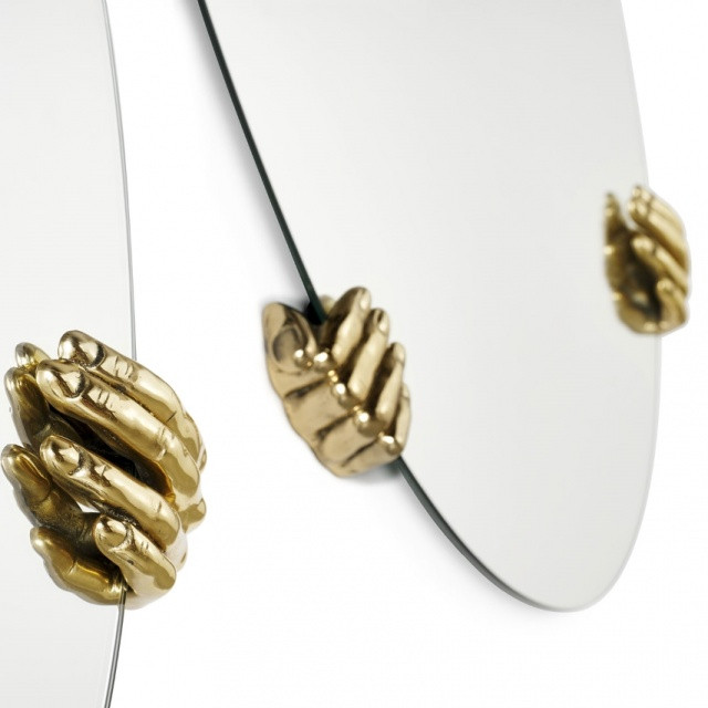 O espelho Selfie da Mogg é um espelho de parede com ponteiros decorativos em latão fundido. A coleção Selfie enfatiza a dimensão ilusória do espelho e multiplica a realidade por meio de uma série de mãos posicionadas na borda dos espelhos, criando diferentes configurações.