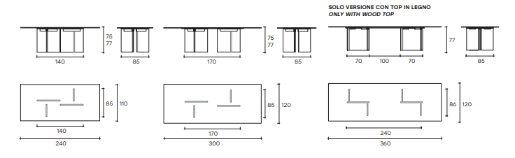 - Madeira de nogueira Canaletto com acabamento em antracite fosco (para dimensões 240 x 110 x A 77 cm, 300 x 110 x A 77 cm, 360 x 110 x A 77 cm)