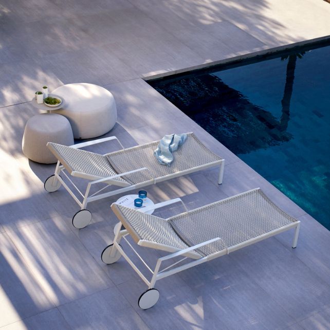 A espreguiçadeira Nodi projetada por Yabu Pushelberg para Tribù é uma espreguiçadeira estilizada caracterizada por um design casual. A silhueta é caracterizada por uma corda trançada em Canax à prova d'água, que se estende sobre uma estrutura de membros longos em aço inoxidável com pintura eletrostática. Essencial e requintada, a espreguiçadeira Nodi combina minimalismo e leveza.